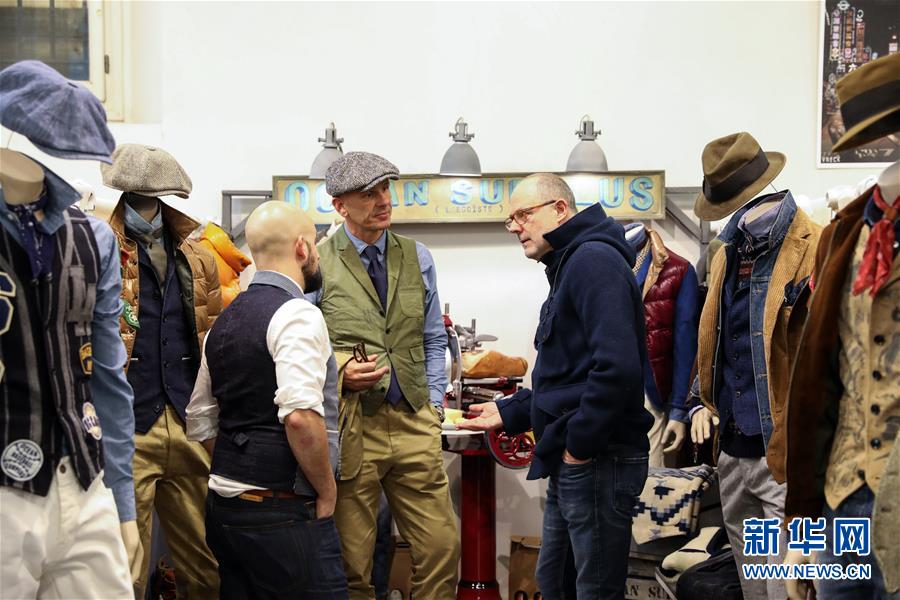 1月8日,在意大利佛罗伦萨,参观者与参展商在第95届佛罗伦萨皮蒂男装展上交谈。 新华社记者程婷婷摄