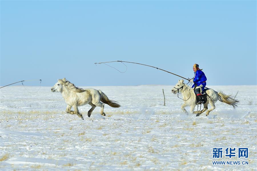 1月8日,牧民进行套马表演。 时下正值草原冬季旅游旺季,内蒙古自治区西乌珠穆沁旗的牧民们在雪原上一展身手,为游客展现独特的民族风情。 新华社记者 邹予 摄