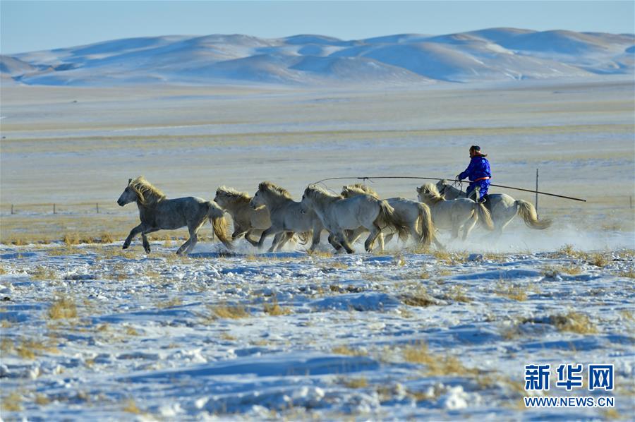 1月8日,牧民进行套马表演。 时下正值草原冬季旅游旺季,内蒙古自治区西乌珠穆沁旗的牧民们在雪原上一展身手,为游客展现独特的民族风情。 新华社记者 邹予 摄