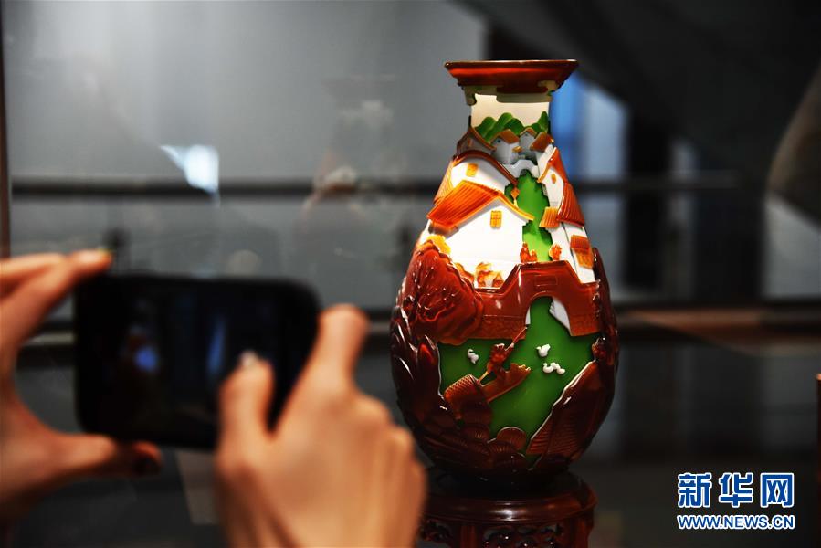 1月8日,游客在淄博陶琉国艺馆内拍摄一只琉璃艺术品。 山东省淄博市是陶瓷和琉璃主产区之一。现在,传统陶瓷和琉璃的制作技艺通过创新有了新的发展,创新技艺制作下的陶瓷和琉璃不仅具备人性化的使用功能,还极具观赏性。 新华社记者 王凯 摄