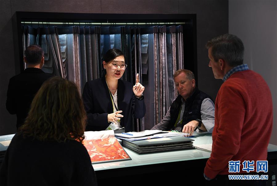 1月8日,在德国法兰克福家纺展上,参观者与一家来自中国的展商洽谈。 新华社记者 逯阳 摄