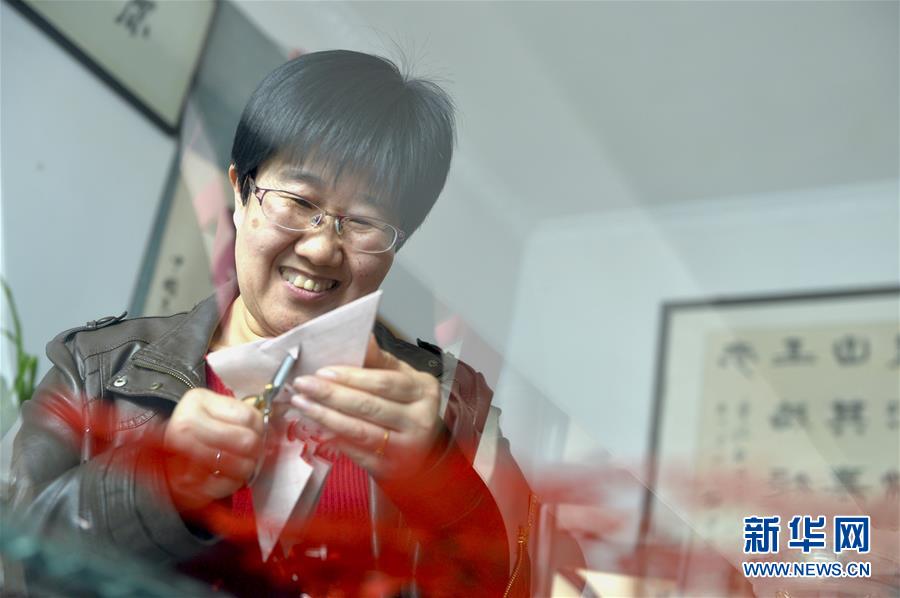 1月10日,惠富君在甘肃省庆阳市镇原县的家中剪纸。