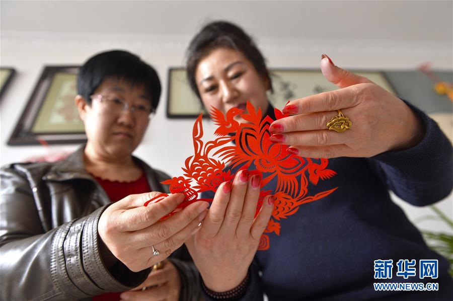 1月10日,惠富君(左)在甘肃省庆阳市镇原县的家中与学生研究剪纸作品。 新华社记者 李笑 摄