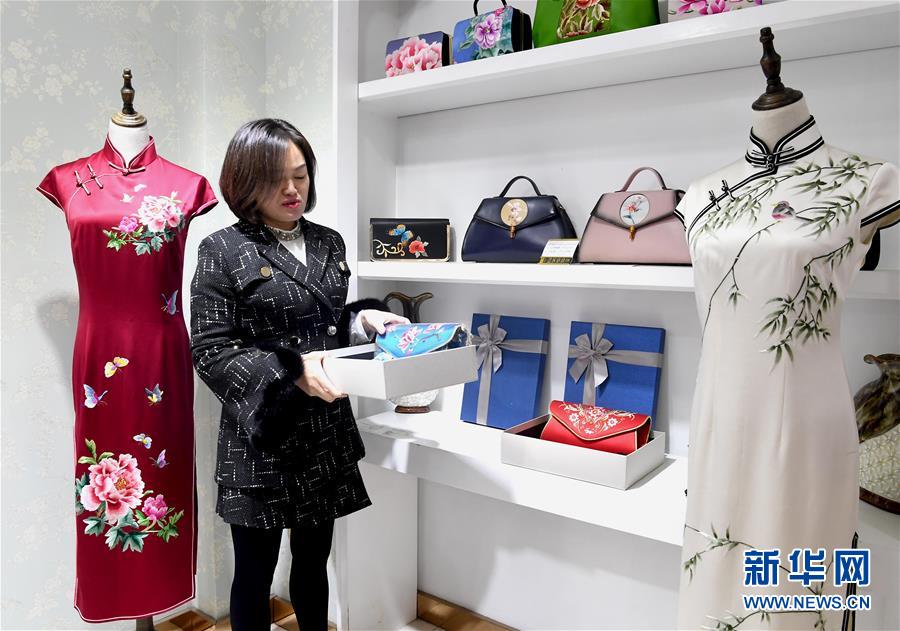 张留凤在公司展厅内展示融入了汴绣的生活用品(2018年12月20日摄)。 新华社记者李安摄