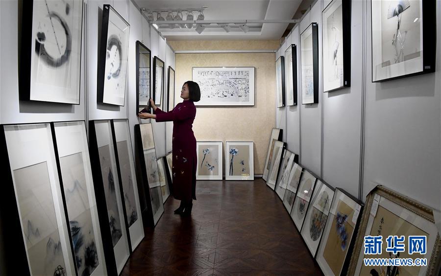 张留凤在公司展厅内摆放汴绣展品(2018年12月20日摄)。 新华社记者李安摄