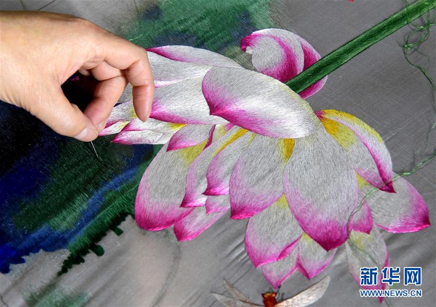 在张留凤创办的公司内,一名绣娘在制作汴绣作品(2018年12月20日摄)。 新华社记者李安摄