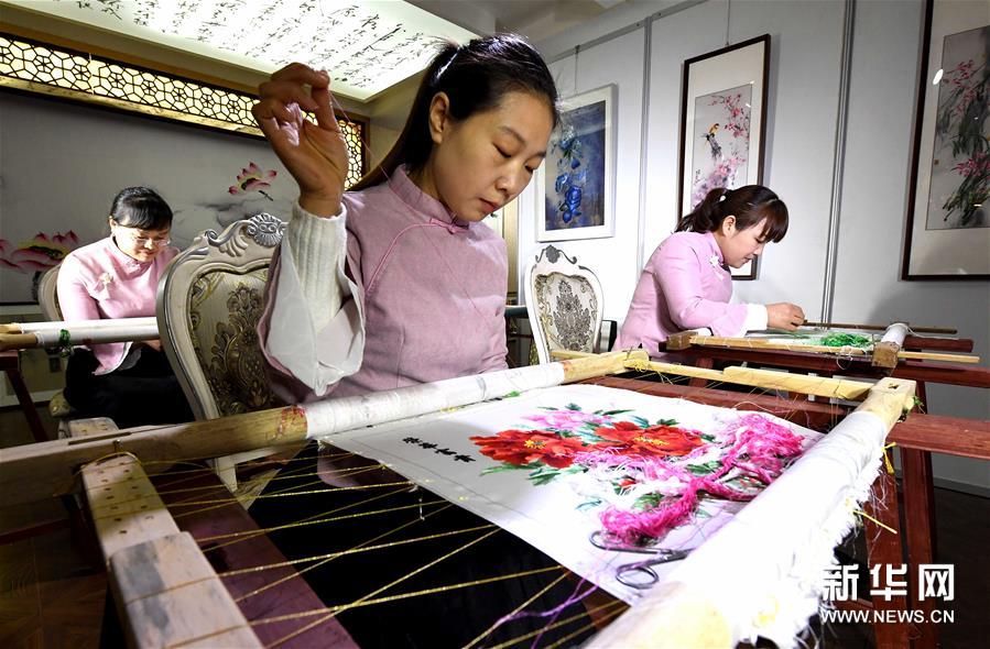 在张留凤创办的公司内,绣娘在制作汴绣作品(2018年12月20日摄)。新华社记者李安摄