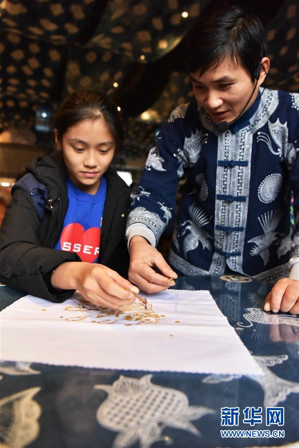 1月10日,在贵州省黔东南苗族侗族自治州丹寨县万达小镇苗族蜡染体验馆,蜡染技师在指导来自广东的学生进行蜡染绘画。新华社发(潘皇权 摄)