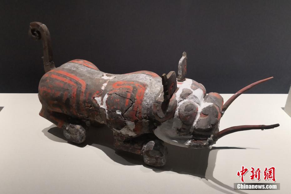 1月10日,“帝国之路·雍城崛起——秦国历史文化展”在秦始皇帝陵博物院文物陈列厅开展。此次展览汇集了秦始皇帝陵博物院和陕西省考古研究院、宝鸡青铜器博物院、陇县博物馆等六家文博单位的186件(组)展品,其中包括秦人的礼乐重器秦公钟和秦公镈、秦景公一号大墓出土的石磬、反映秦吴两国交流的吴王孙鼎等珍贵文物。图为彩绘陶兽。 中新社记者 阿琳娜 摄