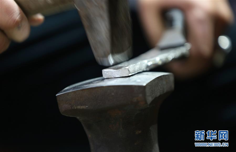 1月13日,在湖南省张家界市武陵源区千凤银生产展示基地,工作人员在捶打银条。 新华社发(吴勇兵 摄)
