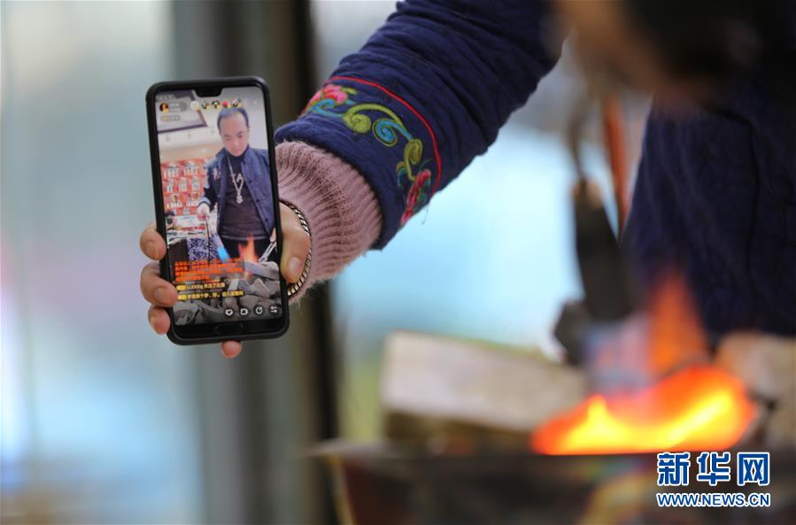 1月13日,在湖南省张家界市武陵源区千凤银生产展示基地,工作人员在直播银饰制作过程。 新华社发(吴勇兵 摄)