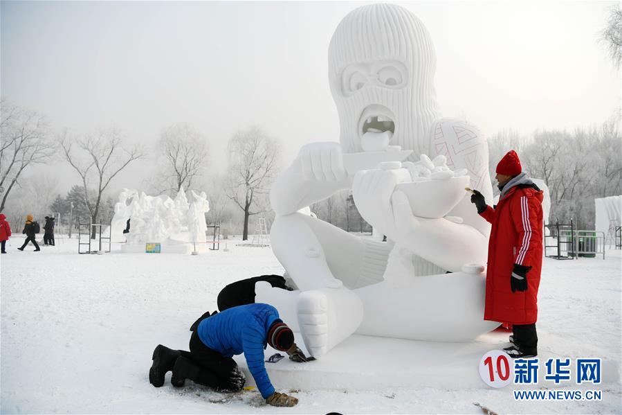 1月13日,墨西哥-加拿大联队的参赛队员在进行雪雕《谷物杀手》的收尾,作品最终获二等奖。新华社记者 王建威 摄