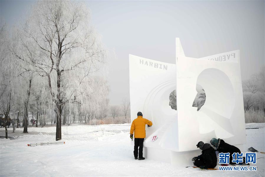1月13日,韩国二队的参赛队员在进行雪雕《开始一段和平之旅》的收尾,作品最终获三等奖。 新华社记者 王建威 摄