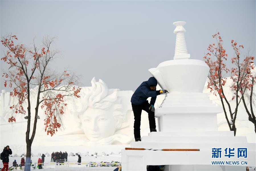 1月13日,印度二队的参赛队员在进行雪雕作品《丝路之门》的收尾。新华社记者 王建威 摄