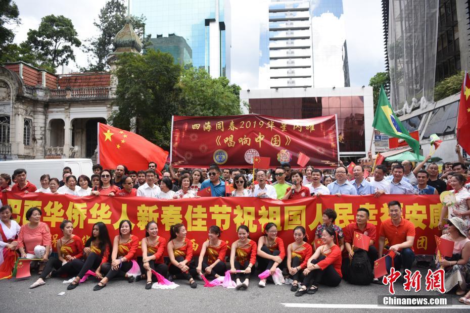 当地时间1月13日下午,由巴西华人协会、圣保罗华助中心和圣保罗华星艺术团联合举办的“2019四海同春 华星闪耀——唱响中国”新春快闪活动,在巴西圣保罗市最繁华的保利斯塔大街上演,吸引上千巴西民众驻足观看。图为巴西华侨华人齐声拜年祝福。中新社记者 莫成雄 摄