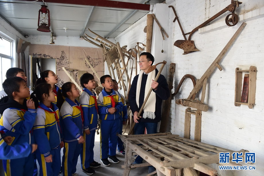 “乡土文化能人”孙建在他的老家沧州新华区芦家园村建设了“村史馆”,这是孙建向小学生介绍各种农具的使用历史。新华网发(傅新春 摄)