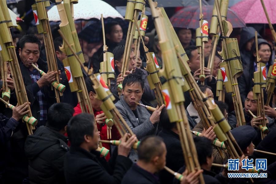 1月14日,人们在广西融水苗族自治县红水乡举行的芦笙节上赛芦笙。 新华社记者 陈君清 摄