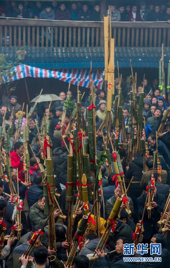 1月14日,人们在广西融水苗族自治县红水乡举行的芦笙节上赛芦笙。新华社记者 陈君清 摄