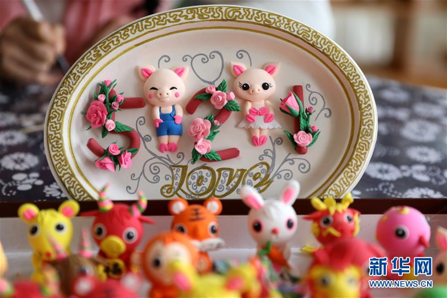 这是1月14日拍摄的山东荣成民间艺人姜雪洁捏制的“萌猪”作品。新华社发(林海珍 摄)