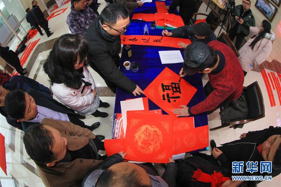 1月15日,在衡阳市白沙洲工业园一家企业内,书法爱好者为员工写春联和福字。新华社发(彭斌 摄)
