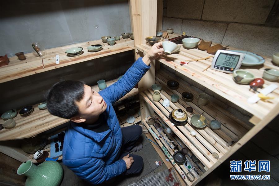 1月15日,吴荣强在龙泉市牛头岭村“七分醉”工作室荫房内查看干燥中的漆缮器皿。新华社记者翁忻旸摄