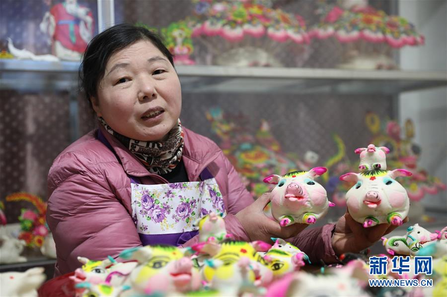 1月15日,合阳县面花艺人杨芬玲展示她创作的生肖猪面花。 春节临近,陕西合阳县的面花成了年节紧俏品,面花艺人忙着赶制面花,以供应节日市场。 面花是广泛流传于民间的一种风俗礼馍,也是一种民间工艺品。 新华社记者都红刚摄