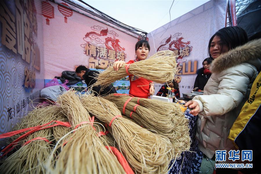 1月18日,在湖南省湘西土家族苗族自治州龙山县体育馆,顾客在年货展销活动上选购红薯粉条。新华社发(曾祥辉 摄)