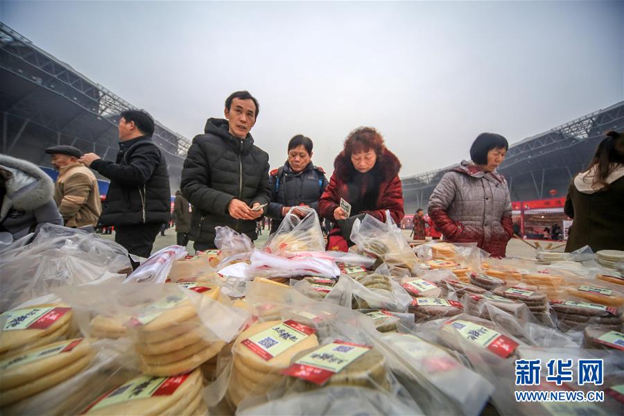 1月18日,在湖南省湘西土家族苗族自治州龙山县体育馆,顾客在年货展销活动上选购糍粑。新华社发(曾祥辉 摄)