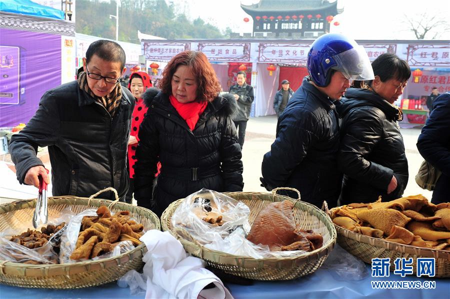 1月18日,在湖北省秭归县屈原故里景区南门广场,人们在春节特色农产品年货会上选购年货。新华社发(王辉富 摄)