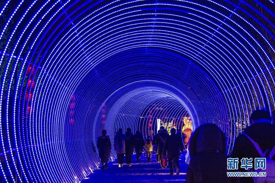 1月20日,游客穿越湖北省襄阳市唐城新春庙会上的“时空隧道”。新华社发(杨东 摄)