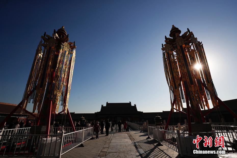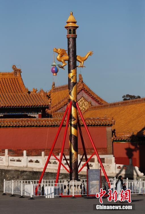 1月21日,北京故宫博物院在乾清宫前丹陛上下树立起“天灯”和“万寿灯”各一对,作为“贺岁迎祥——紫禁城里过大年”展览的实景体验部分正式向观众开放。清代宫廷沿明代旧制,元旦(即今日春节)前后要在乾清宫丹陛上下各立一对天灯和万寿灯,乾隆五十四年开始在皇极殿各增立一对。按《国朝宫史》记载,每年十二月二十四日安设天灯万寿灯。天灯至次年二月初三撤出,万寿灯至正月十八日撤出。立天灯、万寿灯是清代早中期过年最盛大的活动之一。中新社记者 杜洋 摄