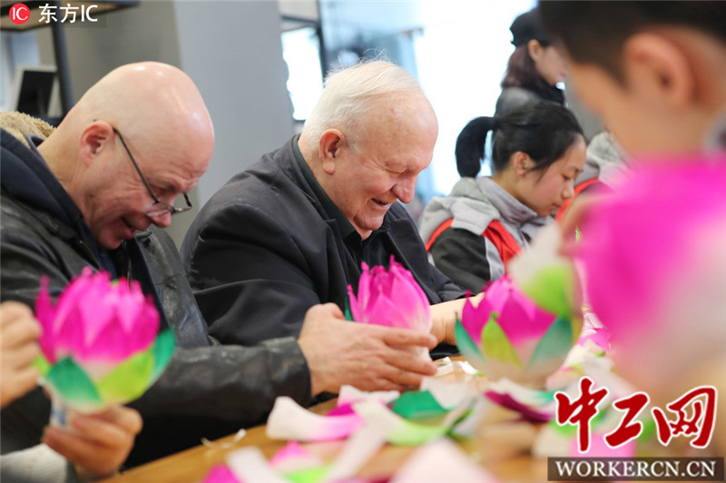 2018年1月23日,在浙江省温州市鹿城区滨江街道,温州肯恩大学外教与学生们一起跟随非遗传承人在制作荷花灯。当日,温州肯恩大学外教与放寒假的中学生们一起走进温州市鹿城区滨江街道非物质文化遗产体验基地,体验荷花灯和温州剪纸制作技艺,了解中国传统非遗技艺,在传统民俗文化中感受浓浓的年味。