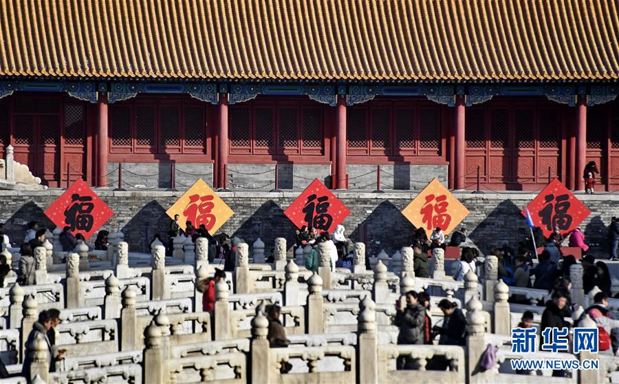 春节将至,北京故宫博物院内张灯结彩,到处悬挂着宫灯、万寿灯、年画、门神、福字等古代宫廷节日装饰品,让来自国内外的游人感受到浓浓的年味。