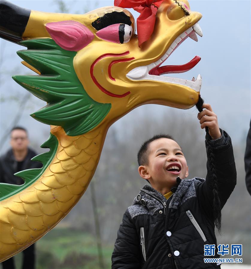 1月26日,在湖南省花垣县边城镇磨老村,一个孩子在摸“龙”须。 当日,湖南省湘西土家族苗族自治州花垣县边城镇磨老村迎来传统苗年,众多苗族同胞欢聚一堂,进行打苗鼓、打糍粑等传统活动,欢欢喜喜过苗年。 新华社发(龙恩泽 摄)