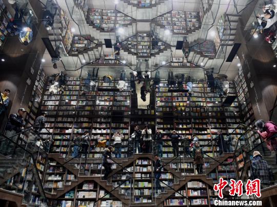 图为重庆一商场现巨型书架,吸引民众拍照留念。 周毅 摄