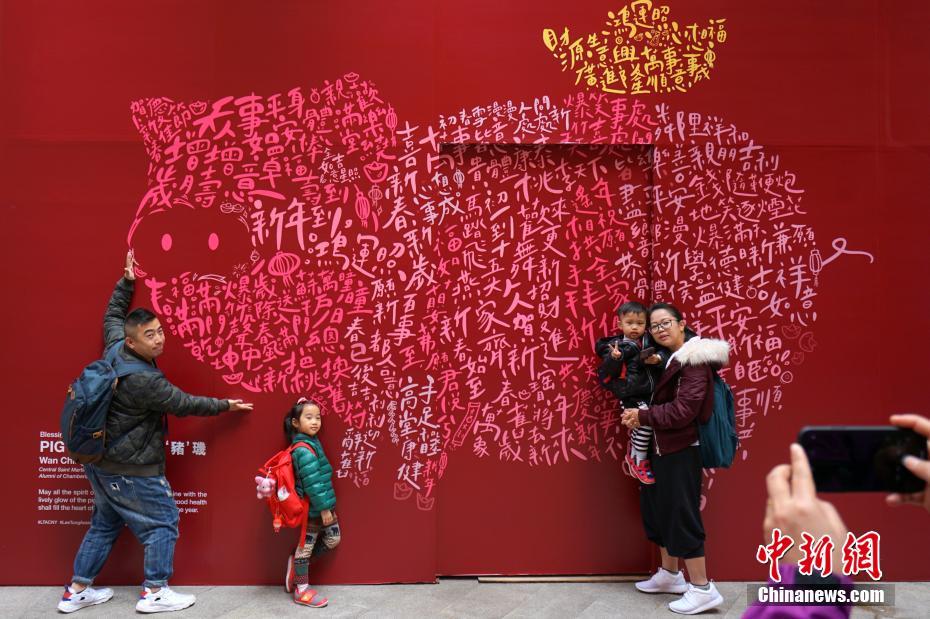 1月27日,农历新年临近,香港街头喜庆气氛越来越浓。一面由各种吉祥话、祝贺语组成的“字字‘猪’玑”墙亮相湾仔利东街,吸引游客拍照留念。