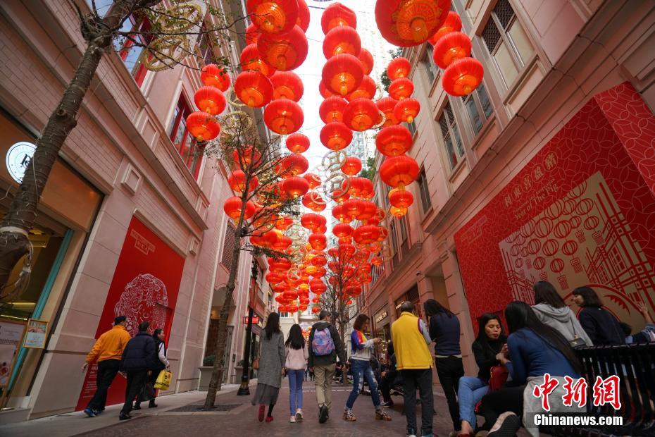 1月27日,农历新年临近,香港街头喜庆气氛越来越浓。工人正在湾仔利东街安装寓意圆满的红灯笼和金光闪闪的金钱。