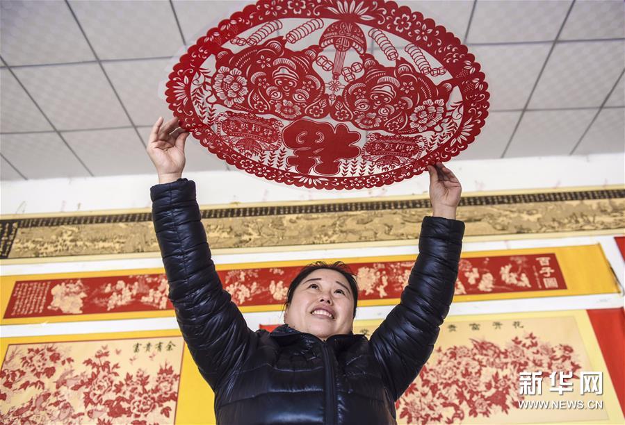 1月27日,河北省阜城县崔庙镇剪纸艺人在展示年俗剪纸饰品。 新华社记者 李晓果 摄