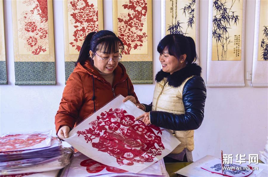 1月27日,河北省阜城县崔庙镇剪纸艺人(右)向客户介绍年俗剪纸饰品。新华社记者 李晓果 摄