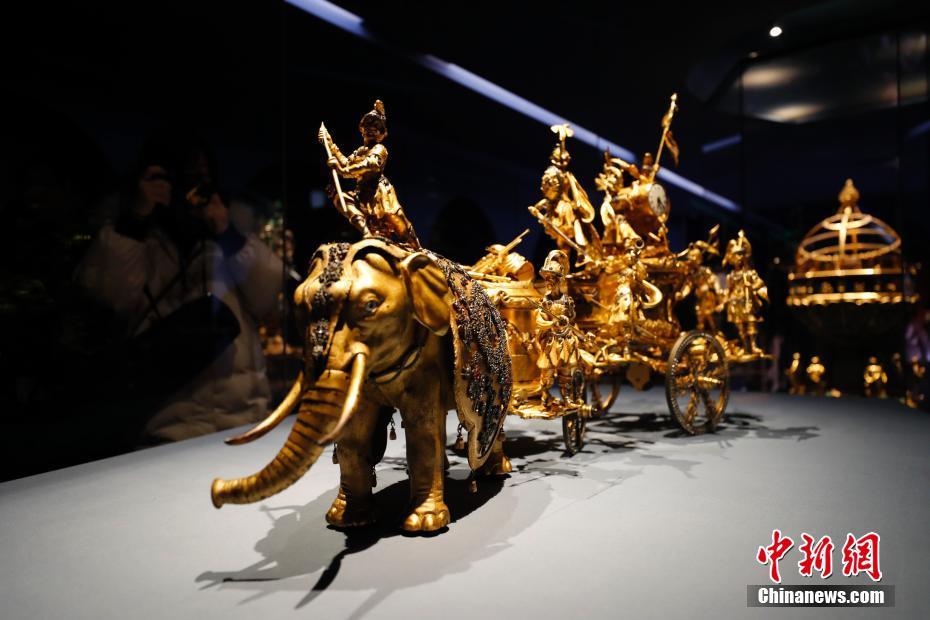 1月28日,北京故宫博物院钟表馆改陈完成,以新面貌与观众见面。新钟表馆目前陈列故宫博物院藏精品钟表82件,其中中国钟表21件,外国钟表61件。82件钟表中,有20件钟表为首次展出。新的展室面积和展品数量虽比奉先殿有所减少,但是原钟表馆里的精品和代表作品在新钟表馆里得到了尽可能的保留。根据故宫博物院展览计划调整,奉先殿钟表馆拟改为奉先殿原状陈列,奉先门南侧的南群房区域改设为新钟表馆。图为铜镀金象拉战车表。中新社记者 杜洋 摄