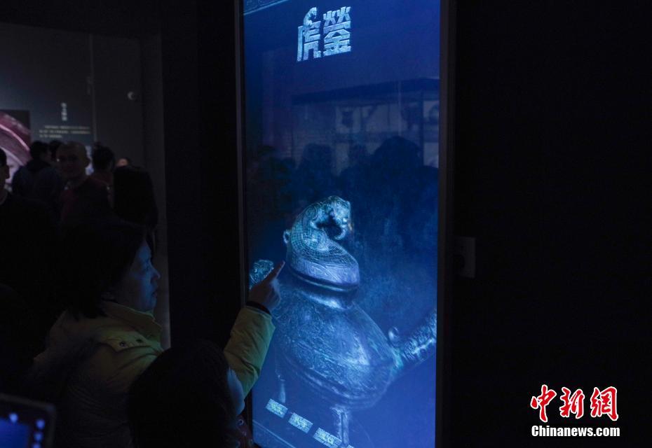 1月29日,“虎鎣:新时代·新命运”展览在北京的中国国家博物馆开幕。“虎鎣”为西周晚期文物,原为清宫旧藏,1860年被英国军官哈利·埃文斯劫掠后由其家族收藏。2018年11月23日,经中国有关部门多方面工作推动流失文物返还,“虎鎣”最终在被安全运回北京。图为观众利用电子屏幕观看“虎鎣”介绍。中新社记者 贾天勇 摄