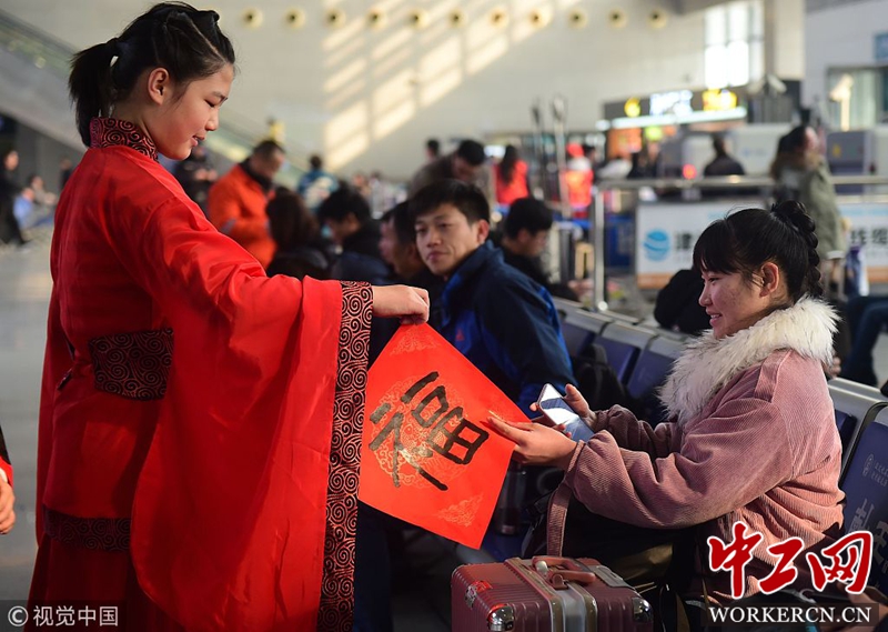 2019年1月29日,在河北沧州西站里,来自沧州市育红小学书法爱好小组的“小书法家们”,在老师的带领下来到候车大厅里,为即将踏上旅途的旅客们书写“福”字。