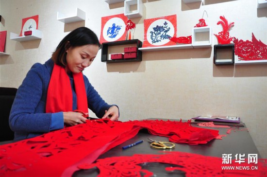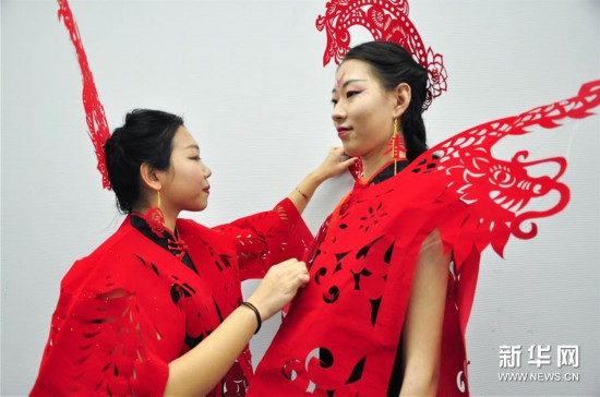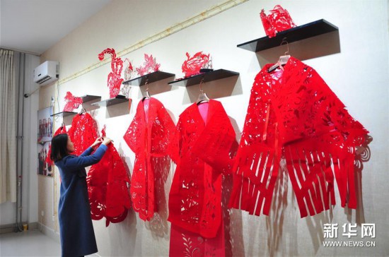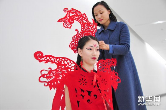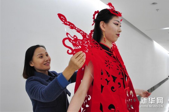 新春临近,山东聊城民间艺人梁颖将传统剪纸应用在服饰设计上,利用植绒布、铜丝和胶水等制作了18套剪纸造型的服饰。中国传统剪纸艺术与服饰的结合令人耳目一新。 新华社发(许文豪 摄)