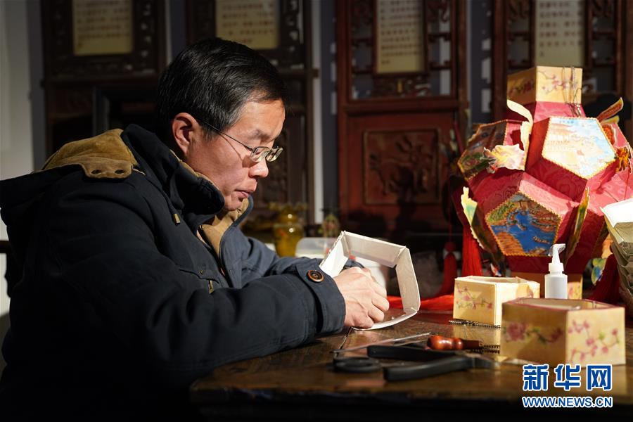 张俊涛在汴京灯笼张民间艺术博物馆制作灯笼(1月15日摄)。