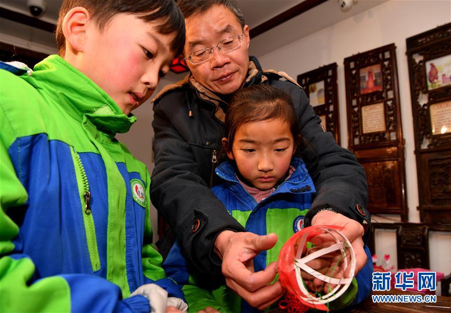 张俊涛在汴京灯笼张民间艺术博物馆教小学生制作小灯笼(1月15日摄)。新华社记者 李嘉南 摄