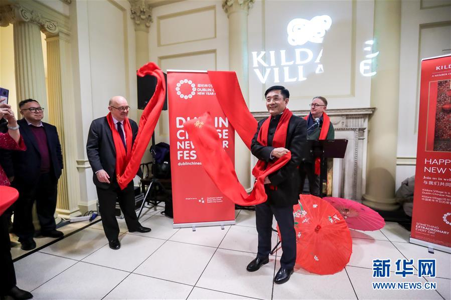 2月1日,在爱尔兰首都都柏林市美术馆,中国驻爱尔兰大使岳晓勇(右二)和爱尔兰驻中国大使李修文(右三)为都柏林中国新年庆典开幕式揭幕。爱尔兰都柏林中国新年庆典开幕式暨音乐会2月1日晚在都柏林市美术馆举行,标志着为期17天的中国新年庆典活动正式拉开帷幕。 新华社发