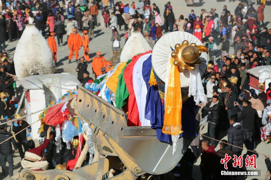 来自西藏各地信众将写有祈愿的经幡系在经幡柱上,祈祷新一年人畜平安、风调雨顺。按照古老传统习俗,此仪式在每年藏历新年初五举办。曲杰 摄