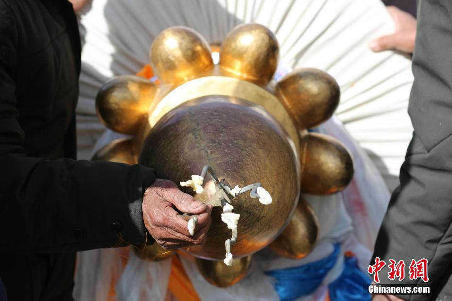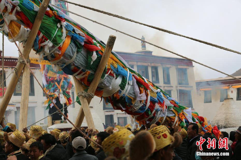 2月9日,在山南市扎囊县,西藏第一座寺庙桑耶寺迎来一年一度的经幡柱“换装”仪式。曲杰 摄