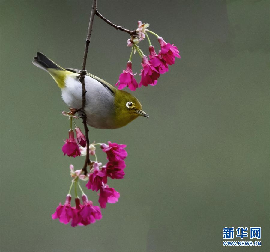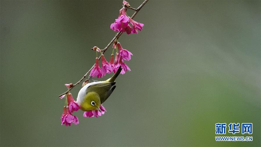 一只绣眼在樱花树枝上嬉戏(2月10日摄)。 初春时节,福建省福州市的樱花、刺桐花、羊蹄甲花渐次绽放,吸引小鸟前来嬉戏、采蜜。 新华社记者梅永存摄