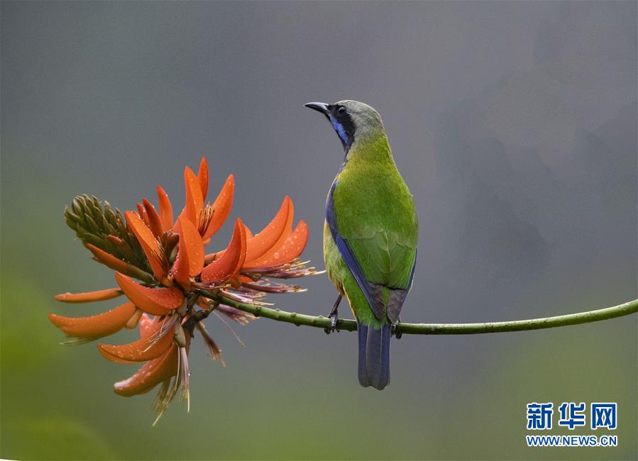 一只橙腹叶鹎在刺桐花枝头嬉戏(2月6日摄)。 初春时节,福建省福州市的樱花、刺桐花、羊蹄甲花渐次绽放,吸引小鸟前来嬉戏、采蜜。 新华社记者梅永存摄